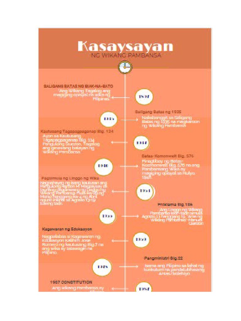 1935 Saligang Batas ArtXIV Sek3 1936 Nob13 Batas Komonwelt Blg184 1937 Nob9 Resolusyon ng SWP Surian ng Wikang Pambansa 1937 Dis30 Kautusang tagapagpaganap Blg134 1940 Abril1 Kautusang tagapagpaganap Blg263 1940 Hunyo 7 Batas komonwelt Blg. 134 1937 Ipinahayag na ang Tagalog ang siyang magiging batayan ng wikang pambansa ng Filipinas. 12 serye 1954 8.