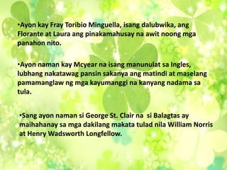 Florante at Laura AWIT Kwentong katha-katha lamang Lalanbindalawahing pantig at kung basahin ay paawit Isang awit ang Florante at Laura batay sa sumusunod na mga matuwid. May 50 taong gulang na si Francisco Baltasar ng panahong iyon. Ang Florante at Laura ay tulang salaysay na uring tula-sinta metrical romance.