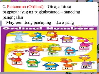 Ang Panlarawan Pantangi at Pamilang. URI NG PANG-URING PAMILANG 2. Panunuran nagsasaad ng ayos o pagkakasunud-sunod ng mga tao o bagay.