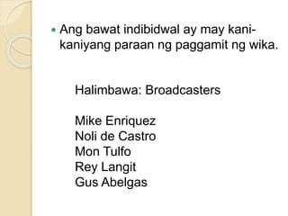 Bilang Varayti ng Wika ABOT-TANAW Matapos ang aralin inaasahang maisasagawa ng mga mag-aaral ang sumusunod. 37 Full PDFs related to this paper. Mga Uri at Halimbawa ng Barayti ng Wika.