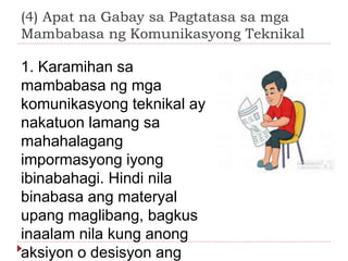 Ang mga ito ay maituturing na anyo ng komunikasyong teknikal dahil kailangan nilang maipamalas ang sariling kakayahan sa pinakapayak na paraan upang. Naikakategorya ang mga uri ng mambabasa ng komunikasyong teknikal.