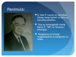 Si José Paciano Laurel y García. Jose Laurel ama Jose III kapatid na lalaki Salvador brother Sotero II kapatid na lalaki Arsenio. ANG KANYANG PAG-AARAL SA MAYNILA San Juan de Letran Sa edad na labinlimang taon ay.