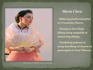 Crisostomo Ibarra Bilang isang anak-mabait mapagmahal maalalahanin Bilang isang kaibigan-mapagmahal mabait Kahalahagahan sa nobela-Siya ang bida sa nasabing nobela 2. Ang buong pangalan niya ay Juan Crisostomo Ibarra y Magsalin. Karibal ni Crisostomo Ibarra kay Maria Clara na isang mayamang Kastila.