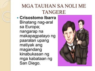 Pasalita at pasulat pangalawang pangkat ng Malay Negrito- unang dumating sa Pilipinas. Sa kasamaang palad napagbintangan siyang nagnakaw ng pera sa simbahan kaya napilitan siyang magtrabaho upang mabayadan ang kanyang utang. JUAN CRISOSTOMO IBARRA y MAGSALIN Si Crisostomo Ibarra ay ang pangunahing tauhan sa Noli Me Tangere.