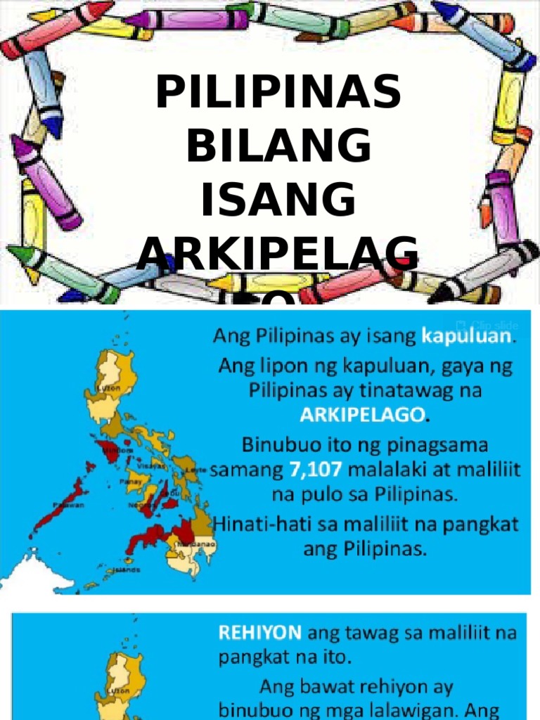 Ang Kulay ng Kahirapan. Tinatawag itong kapuluan dahil ito ay binubuo ng 7 641 malalaki at malilit na pulo. Ang Bansang Pilipinas Bilang Isang Bansang Arkipelago.