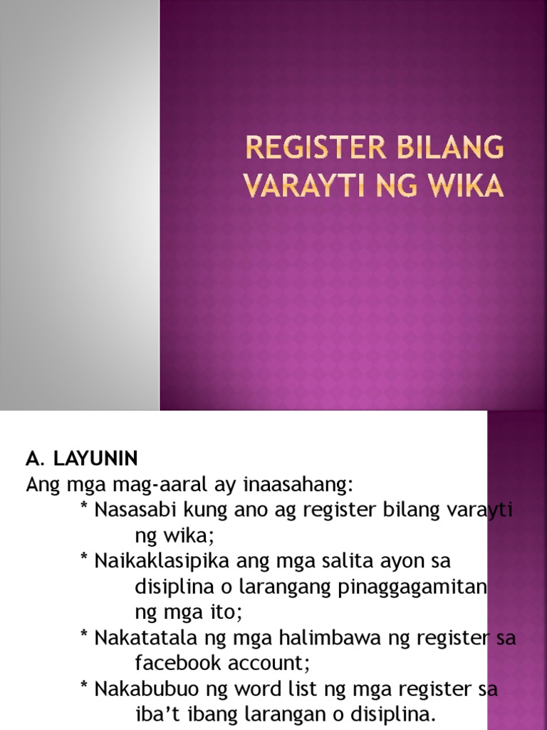 Ano ang barayti ng wika na register. Ayon pa nga kay Constantino 2020pagkakaisa at pagkakaiba. Register bilang varayti ng wika by yleno_me.