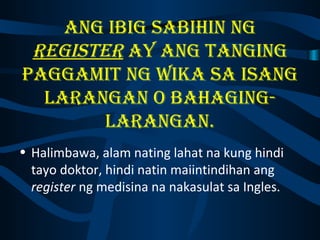 Ito ay napakabisang paraan upang lalong malinang ang iyong paggamit ng wikang. Nabibigyang-kahulugan ang mga salitang mayroong. Pagtalakay sa wikang Pambansa Layunin.